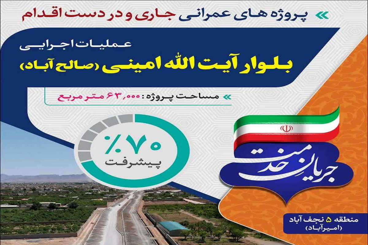 شهردار نجف آباد گفت: در مسیر جریان خدمت، پروژه احداث بلوار آیت الله امینی از جمله ۲۲ پروژه شاخص عمرانی فعال و در دست اقدام شهرداری نجف آباد است که با ۷۰ درصد پیشرفت با برنامه ریزی جدید عملیات اجرایی آن سرعت گرفته است.