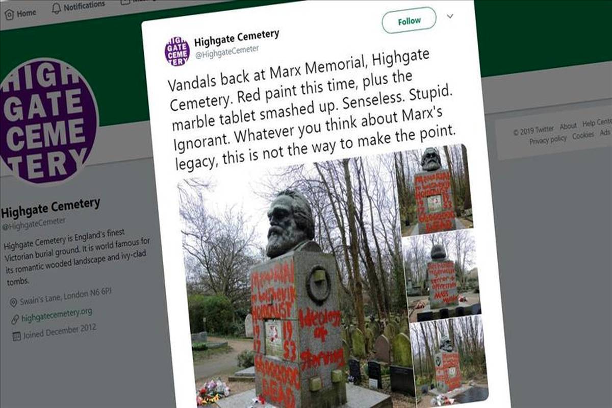 خرابکاران روی مجسمه یادبود و سنگ قبر مارکس عباراتی از قبیل "دکترین نفرت" و "معمار نسل کشی" را با رنگ قرمز نوشته اند. کارل مارکس فیلسوف شهیر آلمانی در سال ۱۸۴۹ به لندن مهاجرت کرد و باقی عمر خود را در این شهر گذراند. وی در ۱۴ مارس ۱۸۸۳ و در زمانی که ۶۳ سال سن داشت درگذشت. مسوولان آسیب وارده به مقبره مارکس را جبران ناپذیر عنوان کرده اند.