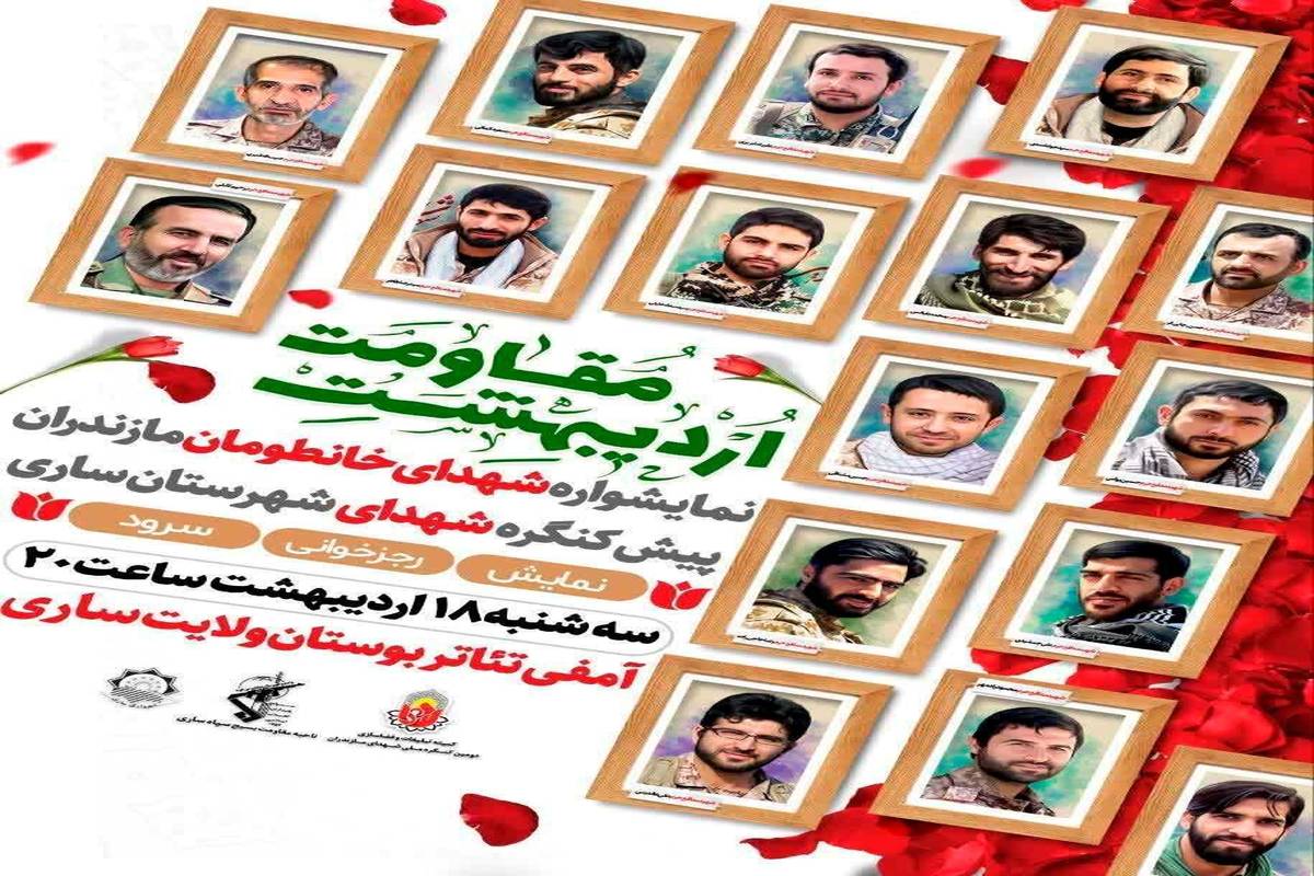 ، همزمان با «اردیبهشت مقاومت» و در آستانه دومین اجلاسیه ۱۰ هزار و ۴۰۰ شهید استان مازندران نمایشواره شهدای مدافع حرم خانطومان سه شنبه ۱۸ اردیبهشت ساعت ۲۰ در آمفی تئاتر بوستان ولایت ساری برگزار میشود.